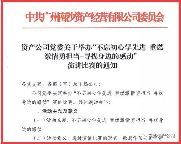 为了掀起学习习近平新时代中国特色社会主义思想、党的十九大精神、习近平总书记视察广东重要讲话精神的热潮,庆祝改革开放40年、资产公司成立16周年,进一步弘扬敢闯敢试、敢为人先的改革精神,焕发逢山开路、遇水架桥的奋进姿态,广泛开展学习先进事迹、争当时代先锋活动,学习和发扬麦旺发同志的优秀品质和崇高精神,牢记“全心全意为人民服务”的根本宗旨,坚持“专业务实·同心共享”的企业理念,树立勤奋实干的工作作风,保持担当作为的工作干劲,发扬尽责奉献的敬业精神,以党建促经营,推动党建和生产经营双融合双促进,以高质量发展成果检验党建成效。资产公司党委决定,在整个公司系统举办以“不忘初心学先进 重燃激情勇担当-寻找身边的感动”为主题的演讲比赛。