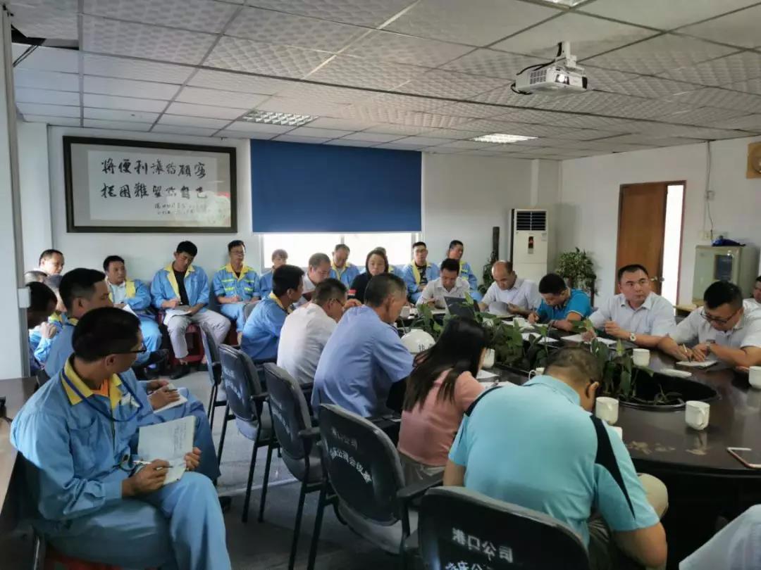 为确保以更加和谐稳定的安全生产环境庆祝新中国成立70周年,2019年9月19日下午,港口公司在南伟码头二楼会议室召开“防风险、保平安、迎大庆”专项行动工作再部署9月安全生产工作会议,港口公司领导、各部门相关负责人以及班组长参加了会议。